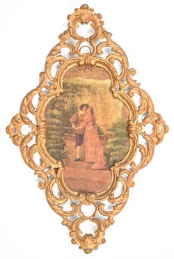 ‘Romantische omhelzing’, olieverf op metalen plaatje in verguld gietijzeren kader.