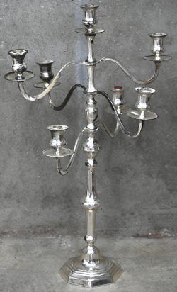 Een grote kandelaar voor 7 kaarsen in verzilverd metaal.