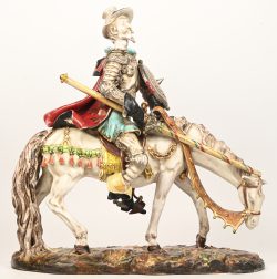 “Don Quichote de la Mancha op Rocinante”. Polychroom porseleinen beeld. Onderaan gemerkt S. Marchi, Italy. Puntje van de speer ontbreekt.