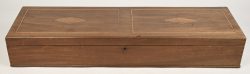 Een gemarqueteerd mahoniehouten kistje, met vakken. Slot en slotplaat zijn manco.