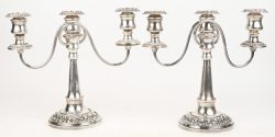 Een paar verzilverde kandelaars met drie armen, Engelse stijl.