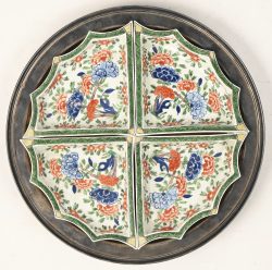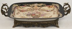 Een porseleinen schaal met een bloemenmand in het decor en een bronzen voetstuk.