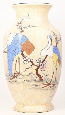 Een aardewerken art-deco vaas met kraanvogels in het decor, gemerkt A. Dubois.