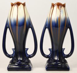Twee aardewerken vazen, art-deco, Faiencerie de Thulin, gemerkt 30 Made in Belgium.