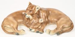 Een vroeg 20ste eeuws geglazuurd keramisch beeld van twee leeuwinnen in rust, gemerkt Wilhelmsfeld.