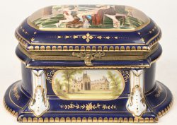 Een porseleinen kistje, kobaltblauw met gevarieerde taferelen en accenten in goudverf, onderaan gemerkt met een kroon, gekruisde zwaarden en A T B.