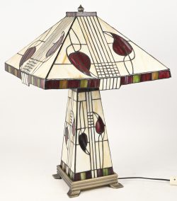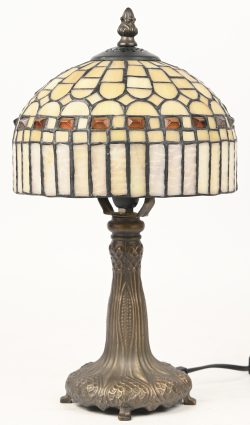 Een tafellamp in Tiffany stijl, één glazen deeltje beschadigd.