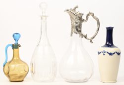 Een lot van 4 karaffen in diverse uitvoeringen, kristal, glas, aardewerk en verzilverd metaal.