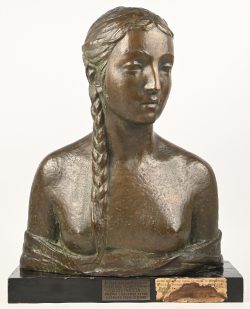 ‘Giovinetta’, een gepatineerde bronzen buste van een jonge vrouw met ontblote borsten. Getekend C. Vigni. Een geschenk aan de consul van Italië, dhr. Gino Pasqualucci.