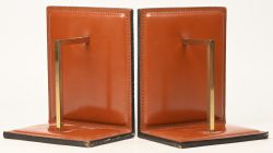Een paar vintage design boekensteunen van leder en messing. Ontworpen door Jaques Adnet.