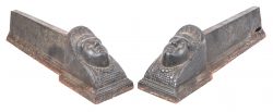 Een paar gietijzeren vuurbokken met vrouwenhoofden.