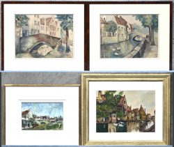 Vier diverse landschappen. Waarvan 1 aquarel met hoeves, “Minnewater te Brugge” door Semail en twee zichten op de Reien te Brugge gemonogrammeerd C.M.