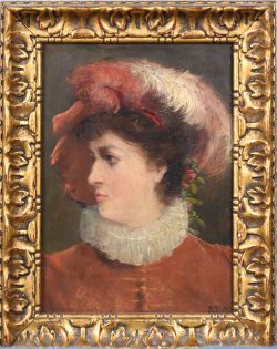 ‘Portret in halfprofiel van een vrouw in 16e eeuwse kledij’. Olieverf op paneel, draagt het monogram S T A. Vermoedelijk 19e eeuw.