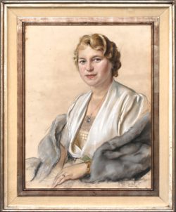 “Mevrouw Verellen, Damesportret”. Houtskool, pastel en aquarel. Gesigneerd en gedateerd Anvers 1937.