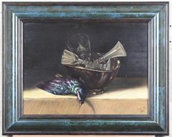 “Stilleven met glaswerk en vogel”. Olieverf op paneel. Gesigneerd en gedateerd. 1992.