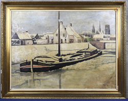 “Zicht vanop de kade”, een schilderij, olieverf op doek, gesigneerd.