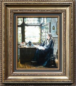 ‘Lezend aan het raam’ Olieverf op paneel. Getekend; J. Dieltjens.