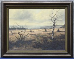 “Heidezicht met open zandvlakte.” Olieverf op doek. Onleesbaar gesigneerd.
