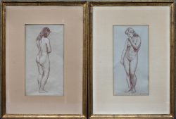 Twee studies naar vrouwelijk naakt. Rood krijt op doek, getekend E. Steel.