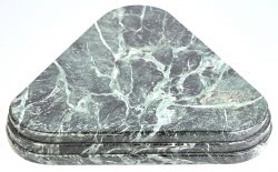 Een driehoekige groene marmeren sokkel met afgeronde hoeken.