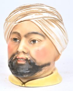 Een oude porseleinen tabakspot in de vorm van het hoofd van een Arabier. Het deksel is gelijmd.