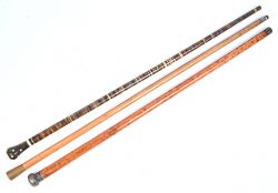 Drie oude wandelstokken waarvan één met een zilveren kop en één van hoorn en been. De derde heeft een kop van hars.