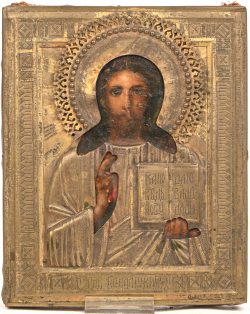 Christus Pantocrator. Een 19e eeuws Russische icoon met koperen riza.
