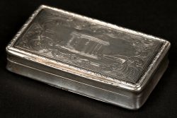 Een siveren sigarettendoosje met een Griekse tempel in het decor. Met een brutogewicht van 105 gram, gemerkt.