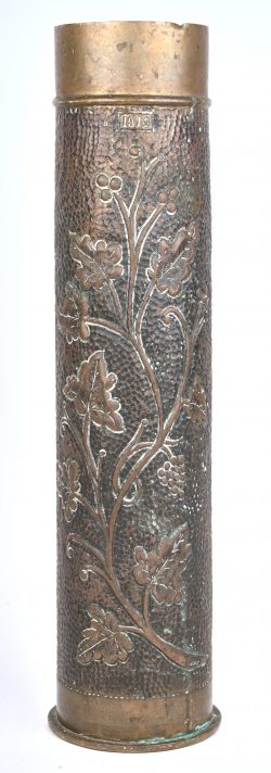 Een grote koperen bewerkte ‘trench-art’ obus met vegetaal decor en opschrift 1914. Onderaan gemerkt ‘Patronenfabrik Karlsruhe, APR 1916, Karth 183, Sp255.