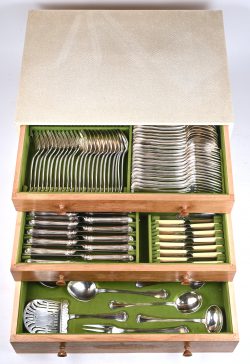 Een 130-delig verzilverd metalen bestek voor 12 personen in cassette, bestaande uit 12 grote vorken, 12 kleine vorken, 12 grote lepels, 10 dessertlepels, 11 koffielepels, 12 grote messen, 12 kleine messen, 12 vismessen, 12 stuks serveerbestek en 1 suikertang. Toegevoegd in de koffer 12 botermesjes gemerkt Sheffield Steel Products en een niet gemerkte kreeftenvorkje.