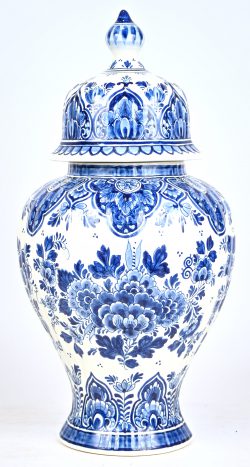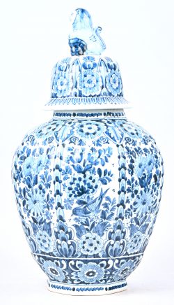 Een dekselvaas van blauw-wit delfts aardewerk, met leeuw als dekselknop. Gemerkt ‘625.VB, Oud Delft’. Met certificaat.