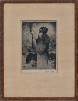 ‘Vrouw met kind’, een monochrome ets. Getekend K. Peiser, binnen en buiten de plaat K. Peiser.