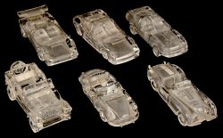 Zes kristallen modelauto’s door Hofbauer, West-Germany. Vijf sportwagens en een jeep.
