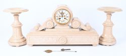 Een marmeren mantelklok met bijpasende ornamenten. De wijzerplaat is gemerkt ‘A. Kreits, Anvers’.