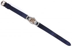 Een art deco dameshorloge van geciseleerd platina bezet met briljanten met een gezamenlijk gewicht van +- 0,30 ct. een saffier cabochon en lederen polsband.