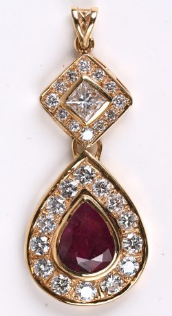 Een 18 kt geelgouden hanger bezet met een druppelvormige robijn van +- 1,30 ct. en briljanten en diamanten princes cut met een gezamenlijk gewicht van +- 1,50 ct.