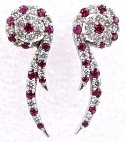 Een paar 18 kt witgouden oorbellen bezet met robijnen met een gezamenlijk gewicht van +- 0,54 ct. en briljanten met een gezamenlijk gewicht van +- 0,50 ct.