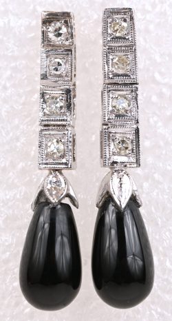 Een paar 18 kt witgouden oorbellen bezet met briljanten met een gezamenlijk gewicht van +- 0,16 ct. en onyx.