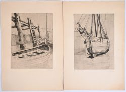 ‘Lolly of Guernsey’ & ‘Palen en sloep’, twee monochrome etsen. Getekend R. Schönberg. Zonder kader.