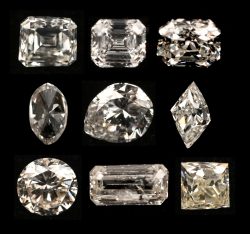 Eight different cuts of natural diamonds including: Pear cut H F P2. 0.20 ct. Marquise cut H P2. 0.11 ct. Round cut G P1. 0.28 ct. Baguette cut. I P2. 0.16 ct. Diamond cut H VS2. 0.16 ct. Radiant cut D SI. 0.15 ct. Emerald cut twice. G SI. 0.17 ct. and F VS1. 0.25 ct. Princess cut K SI2. 0.19 ct.