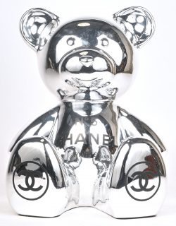 “Een Teddy Chanel”. Een zilverkleurig beeld van een beer met logo van parfum Nr. 5. In originele doos. (heeft een wit vlekje tussen de bil).
