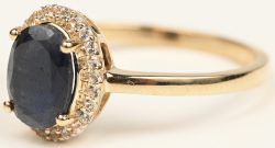 Een 14 kt geelgouden ring bezet met een centrale saffier van +- 1 ct. en briljanten met een gezamenlijk gewicht van +- 0,30 ct.