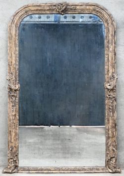 Een geslepen spiegel in gesculpteerd eikenhouten kader.