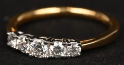 Een 18 kt wit-en geelgouden ring bezet met briljanten met een gezamenlijk gewicht van 0,52 ct.
