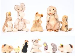 Vijf pluche knuffels, één varken, twee everzwijnen en twee kangoeroes, op de kleinste kangoeroe na allen gemerkt Steiff.