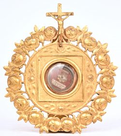 Copper reliquary with relic of St. Theresia. Numbered Ex 088.Photos: 2Dim. Ø 12 & 2,5 cmEstimate: € 80/120 -