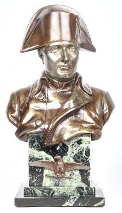 “Napoleon I”. Een bronzen borstbeeld met donkerbruin patina op groengeaderde marmeren basis. Gesigneerd.