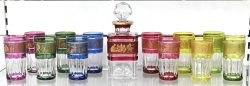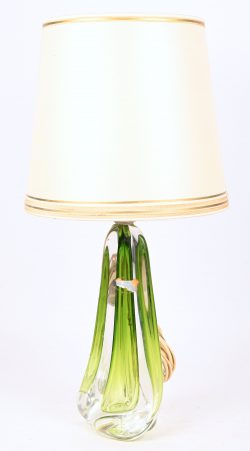 Een tafellamp met kristallen voet, groen in de massa gekleurd, gemerkt.