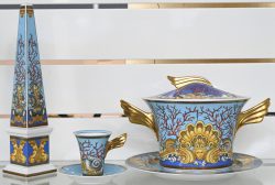 Rijkelijk gedecoreerde porseleinen stukken: een kopje en schoteltje, een dekselpot en onderschaal en een obelisk.