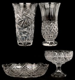 A lot of two vases and a bowl made of colorless crystal. Also included is an oval dish made of pressed VSL glass.Photos: 3Dim. Hoogte 14-25 cmEstimate: € 50/70 -